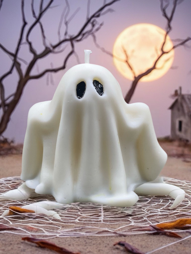 Ajoutez une ambiance mystérieuse et chaleureuse à votre fête d'Halloween avec notre bougie Fantôme unique et artisanale.